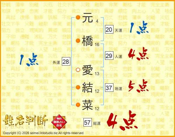 元(4画)橋(16画) 愛(13画)結(12画)菜(12画)