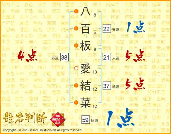 八(8画)百(6画)板(8画) 愛(13画)結(12画)菜(12画)