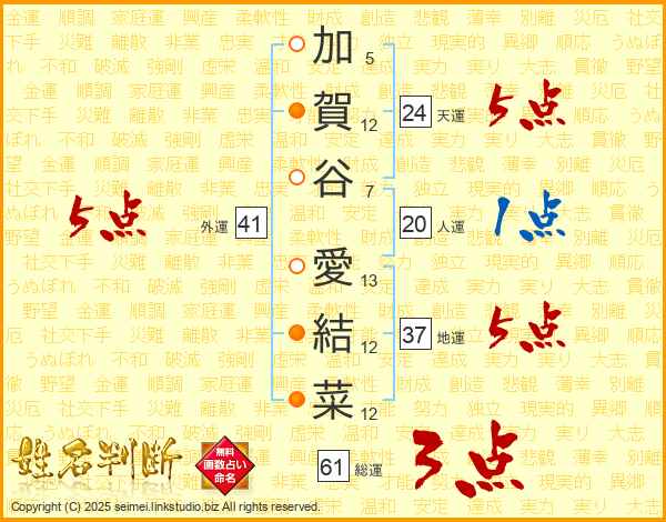 加(5画)賀(12画)谷(7画) 愛(13画)結(12画)菜(12画)