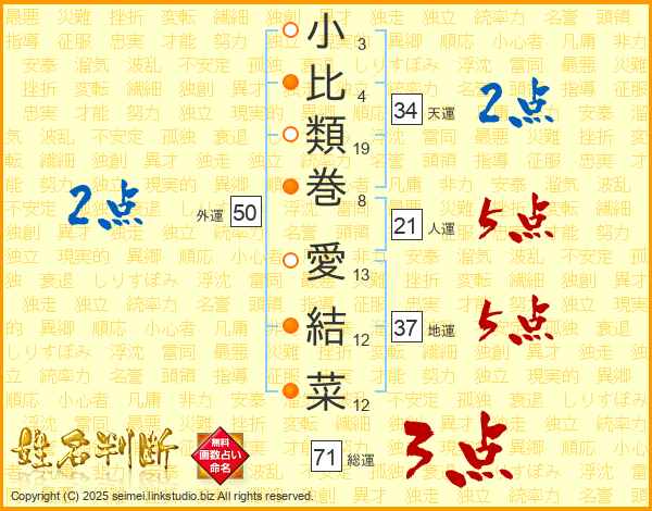 小(3画)比(4画)類(19画)巻(8画) 愛(13画)結(12画)菜(12画)