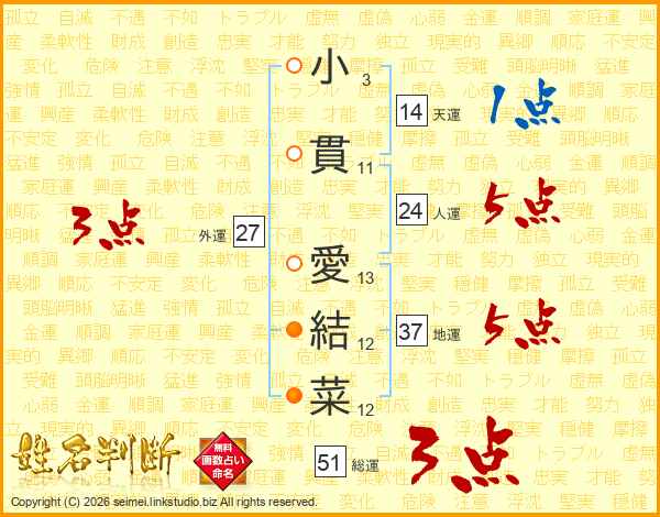 小(3画)貫(11画) 愛(13画)結(12画)菜(12画)