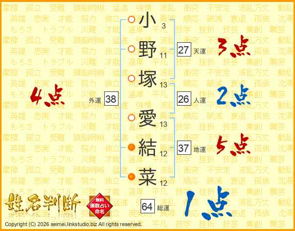 小(3画)野(11画)塚(13画) 愛(13画)結(12画)菜(12画)