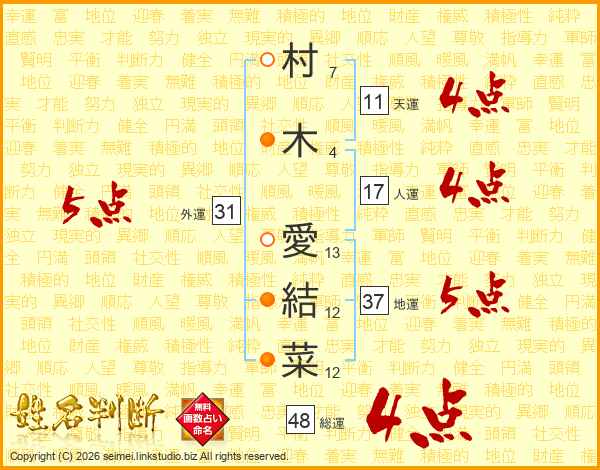 村(7画)木(4画) 愛(13画)結(12画)菜(12画)