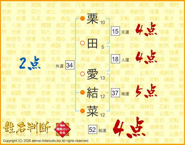 栗(10画)田(5画) 愛(13画)結(12画)菜(12画)