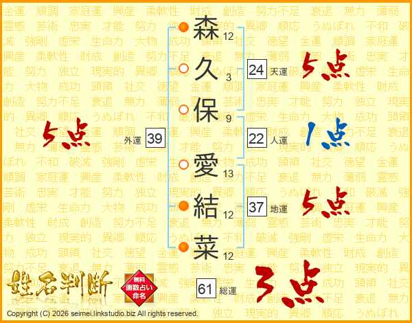 森(12画)久(3画)保(9画) 愛(13画)結(12画)菜(12画)