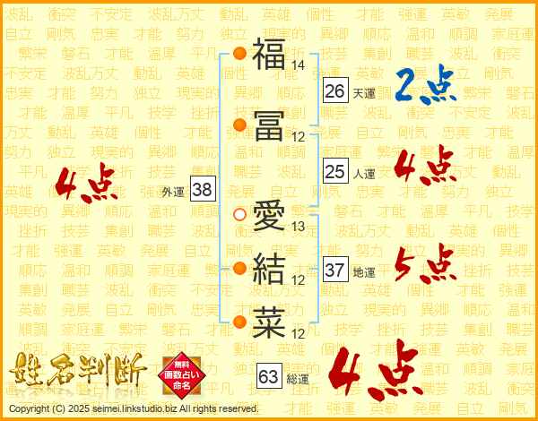 福(14画)冨(12画) 愛(13画)結(12画)菜(12画)