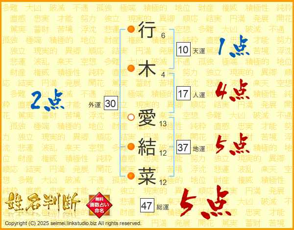 行(6画)木(4画) 愛(13画)結(12画)菜(12画)