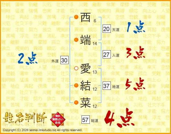 西(6画)端(14画) 愛(13画)結(12画)菜(12画)