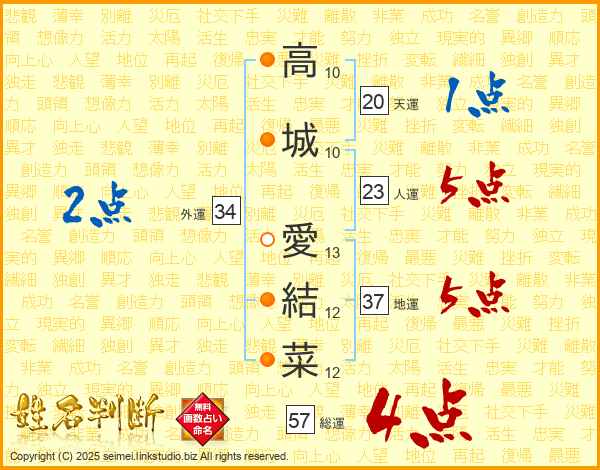 高(10画)城(10画) 愛(13画)結(12画)菜(12画)