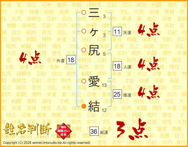 三(3画)ヶ(3画)尻(5画) 愛(13画)結(12画)