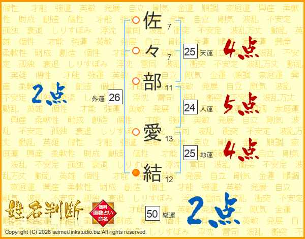 佐(7画)々(7画)部(11画) 愛(13画)結(12画)