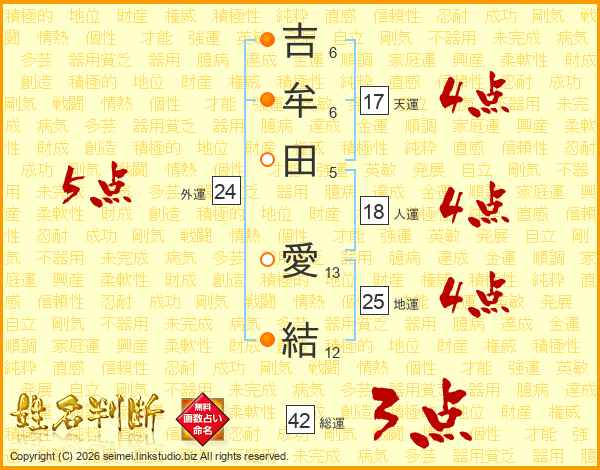 吉(6画)牟(6画)田(5画) 愛(13画)結(12画)