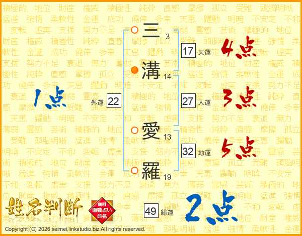 生活面を象徴する運勢です。外部から受ける影響力を表し、結婚運、家庭運や職場、環境への順応性を表します。総運から人運を引いた画数。姓や名が1文字の場合を除く。