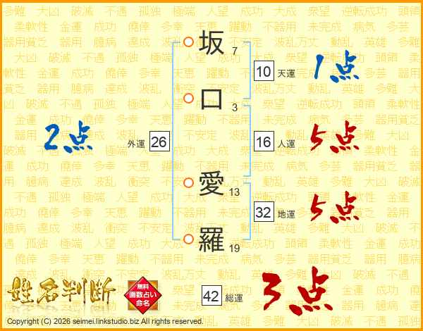 坂(7画)口(3画) 愛(13画)羅(19画)