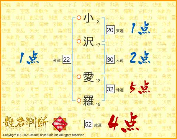 小沢愛羅さんの総運は52画の4点!