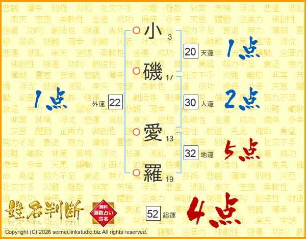 小(3画)磯(17画) 愛(13画)羅(19画)