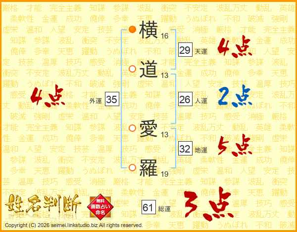 生活面を象徴する運勢です。外部から受ける影響力を表し、結婚運、家庭運や職場、環境への順応性を表します。総運から人運を引いた画数。姓や名が1文字の場合を除く。