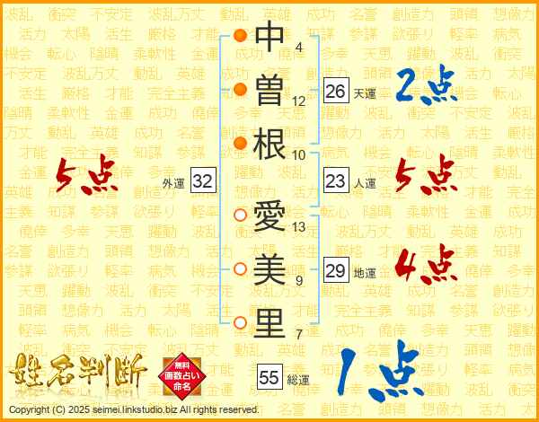 中(4画)曽(12画)根(10画) 愛(13画)美(9画)里(7画)