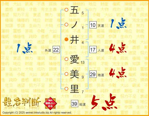 五(5画)ノ(1画)井(4画) 愛(13画)美(9画)里(7画)