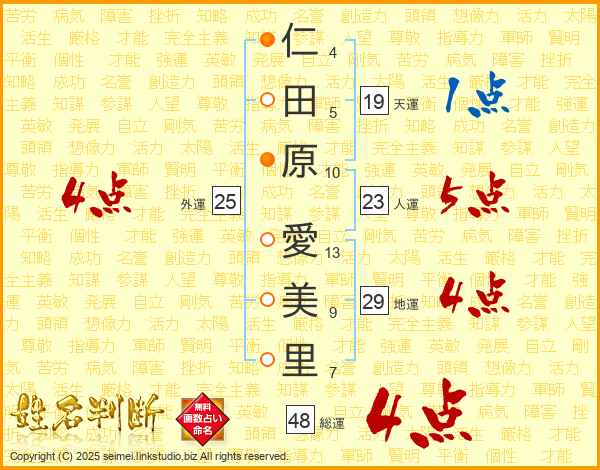仁(4画)田(5画)原(10画) 愛(13画)美(9画)里(7画)