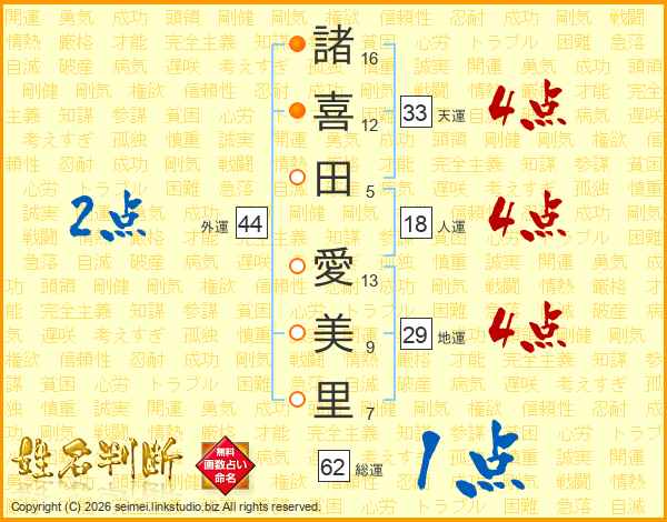 諸(16画)喜(12画)田(5画) 愛(13画)美(9画)里(7画)