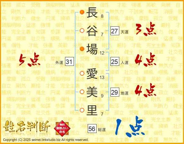長(8画)谷(7画)場(12画) 愛(13画)美(9画)里(7画)