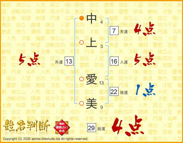 中(4画)上(3画) 愛(13画)美(9画)