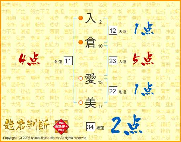 入(2画)倉(10画) 愛(13画)美(9画)