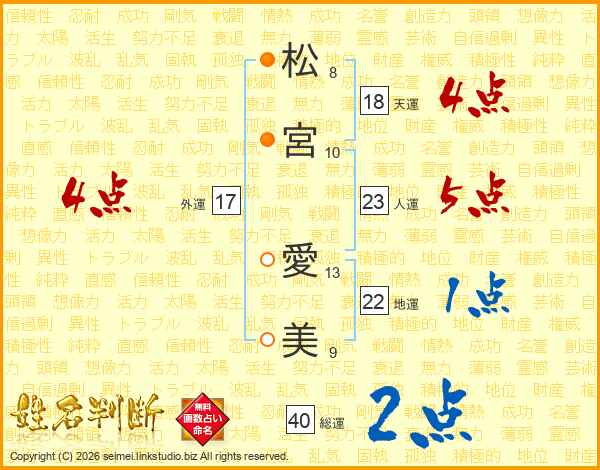 松(8画)宮(10画) 愛(13画)美(9画)