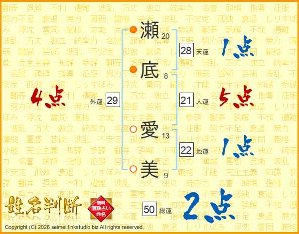 瀬(20画)底(8画) 愛(13画)美(9画)