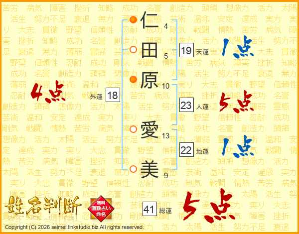 仁(4画)田(5画)原(10画) 愛(13画)美(9画)