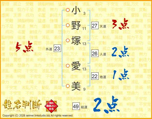 小(3画)野(11画)塚(13画) 愛(13画)美(9画)