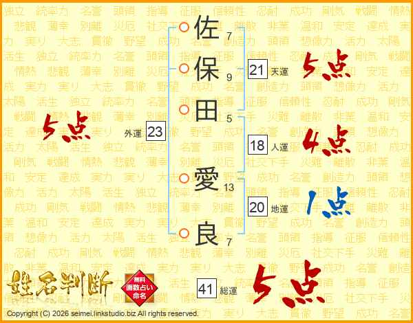 佐(7画)保(9画)田(5画) 愛(13画)良(7画)