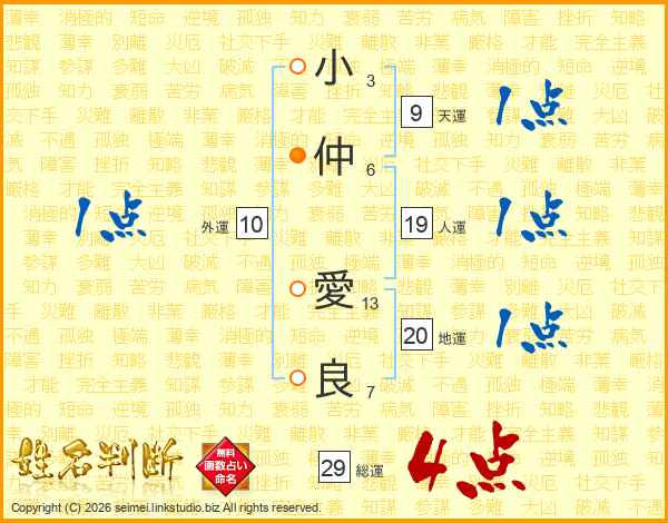 小(3画)仲(6画) 愛(13画)良(7画)