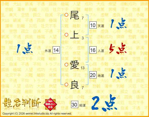 尾(7画)上(3画) 愛(13画)良(7画)