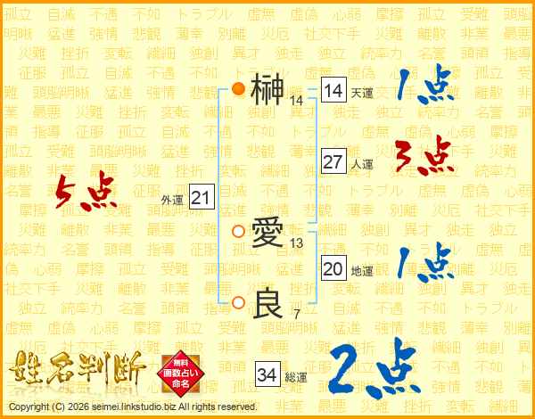 生活面を象徴する運勢です。外部から受ける影響力を表し、結婚運、家庭運や職場、環境への順応性を表します。総運から人運を引いた画数。姓や名が1文字の場合を除く。