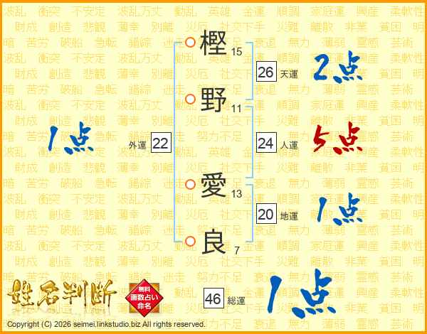 樫野愛良さんの総運は46画の1点!
