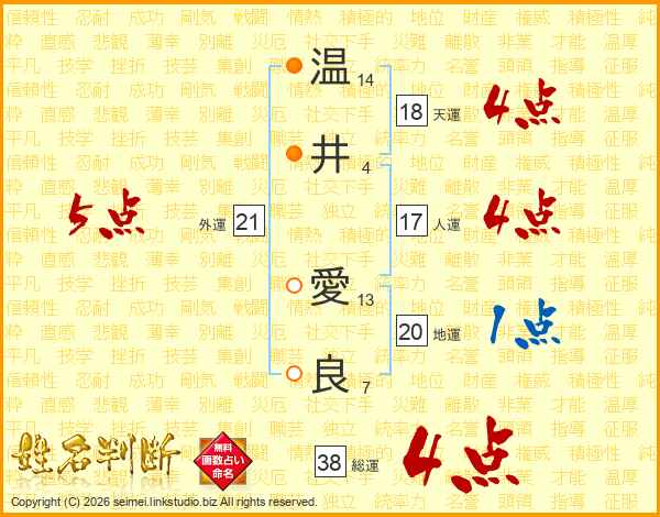 温(14画)井(4画) 愛(13画)良(7画)