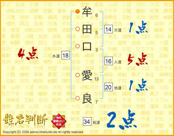 牟(6画)田(5画)口(3画) 愛(13画)良(7画)