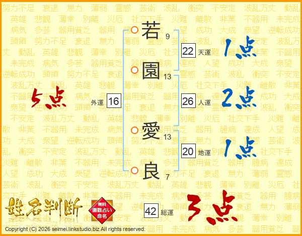 若(9画)園(13画) 愛(13画)良(7画)