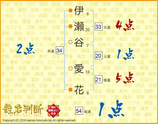 伊(6画)瀬(20画)谷(7画) 愛(13画)花(8画)