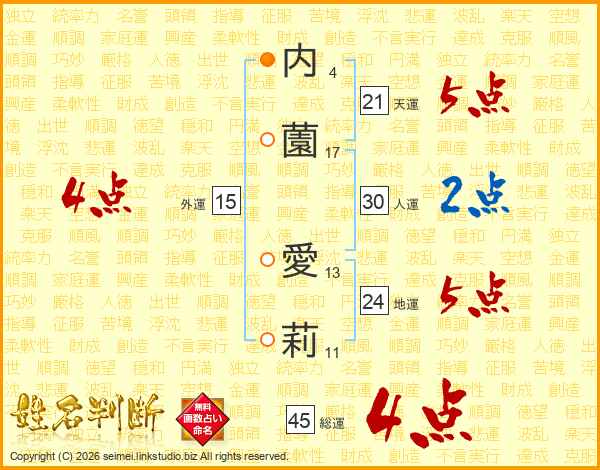 内(4画)薗(17画) 愛(13画)莉(11画)