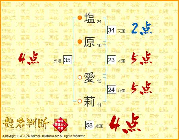 塩原愛莉さんの総運は58画の4点!