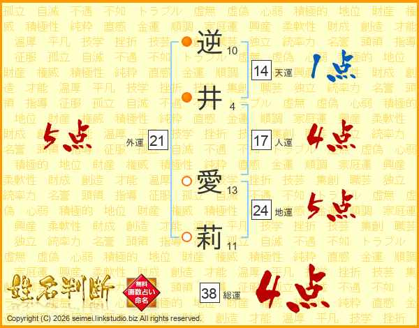 逆(10画)井(4画) 愛(13画)莉(11画)