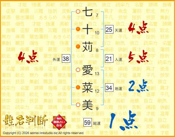 七十苅愛菜美さんの外運は38画の4点!