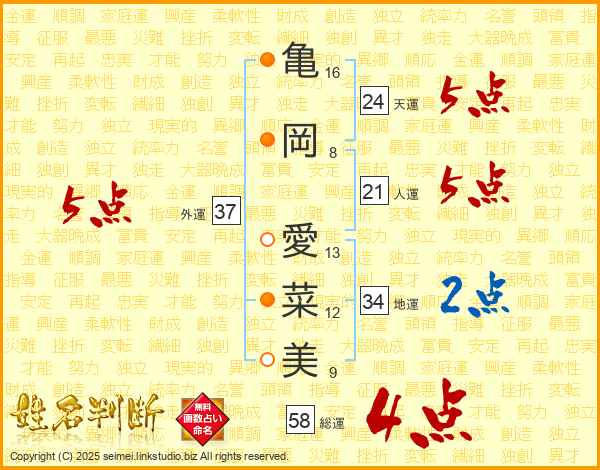 亀岡愛菜美さんの総運は58画の4点!