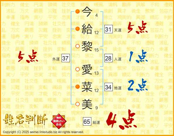 今(4画)給(12画)黎(15画) 愛(13画)菜(12画)美(9画)