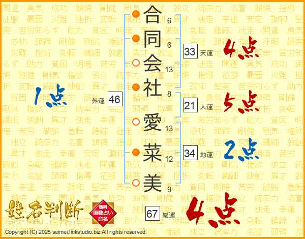 合同会社愛菜美さんの天運は33画の4点!