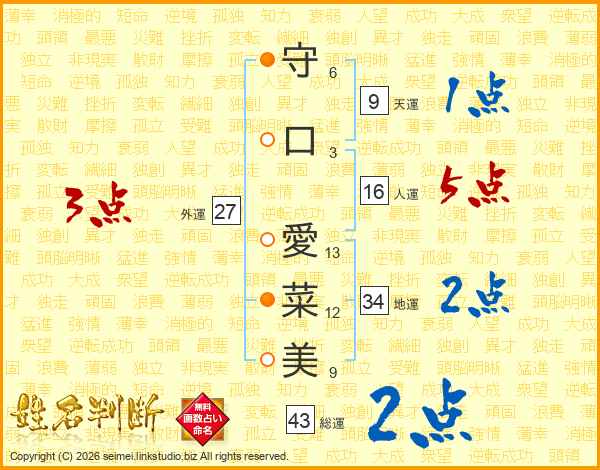 守(6画)口(3画) 愛(13画)菜(12画)美(9画)