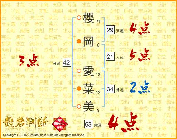 櫻岡愛菜美さんの総運は63画の4点!